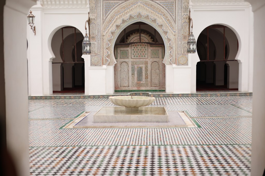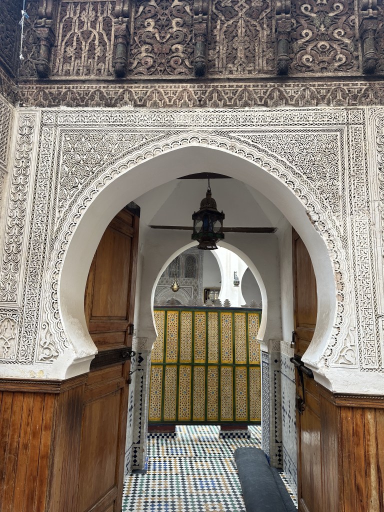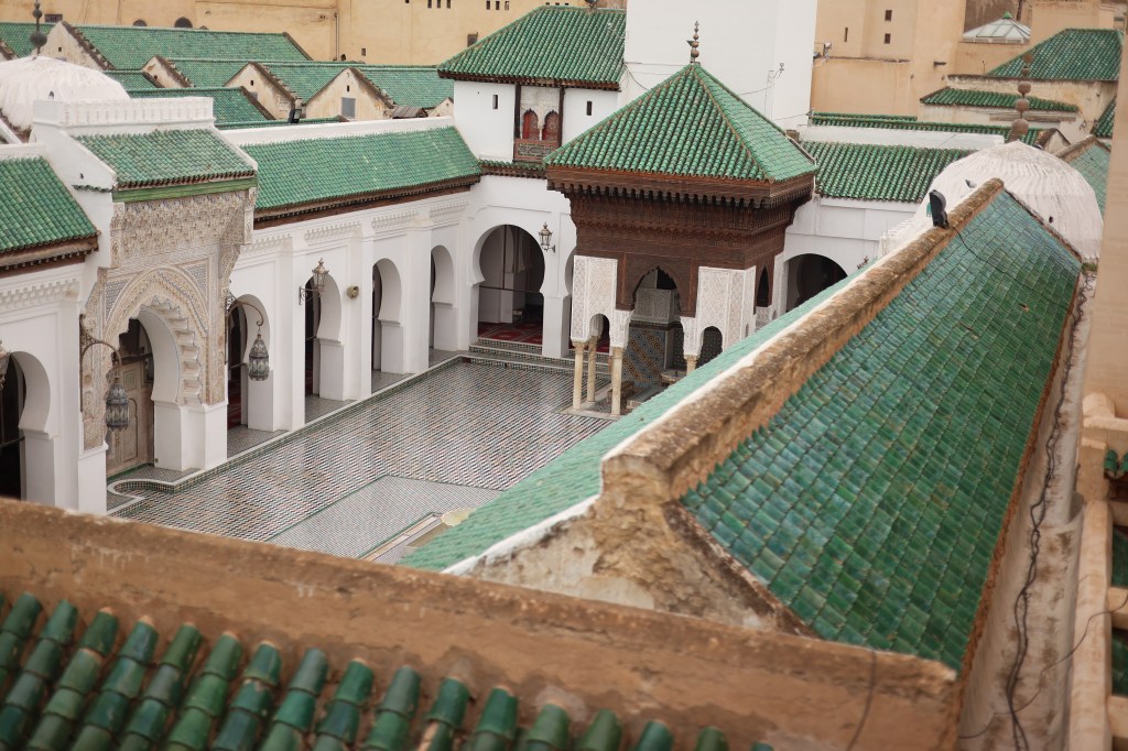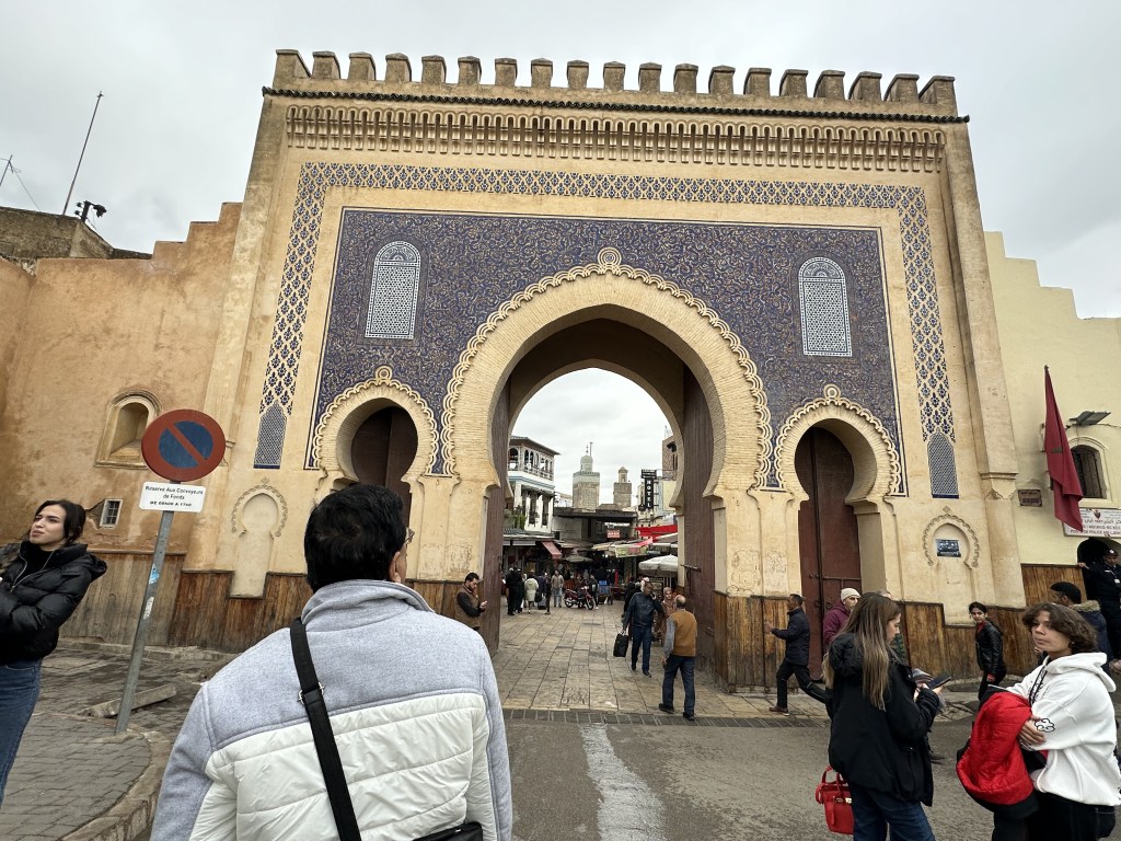 We were nearing Fes- the hilly terrain is a scenic beauty. For miles together, in the medians between either side of the road, fruit bearing orange trees are grown. Bunches and bunches of the fruit hangs from the trees. The city comprises of two parts- the new town of the modern world entirely, comprised of wide boulevards, posh villas- malls & modern shops and of course, busy traffic. The old historic town is a preserved UNESCO world heritage site of the fourteenth century. The whole town is enclosed by tall walls- a gated community of the by-gone era(!) referred to as the Medina. We enter it from the uphill through what is referred the Blue Gate. Within its myriad medieval streets, a wonderland of vibrant colours of the tiles, artefacts, hand-hammered intricate brass lamps, the styled footwear babouches, colourful pottery, varied smells from the perfume souks, sweetmeat, dry fruits, traditional food shops, the ubiquitous Moroccan tea, leather products, local artisans and painters at work, the rhythmic noise from the blacksmith-all in an endless maze of dozens and dozens of narrow streets. We saw a street -the narrowest ever seen so far -beating down any other one in comparison (our good old triplicane streets are poor cousins of this one !!). The width is hardly two feet. It was built in such a way to desist enemies entering. Every house here has numerous windows and all structures are tall. Whenever attacked and enemies try to sneak in, windows will be opened in synchronisation to affect their movement and hot oil poured over them from the terrace. The amazing thing is that, people still dwell there – the house inside will be unassumingly palatial- they call it a Riad. It is one of the world’s largest pedestrian zones. Donkey carts alone are allowed to ply in some alleys for transporting goods. We came across few architectural landmarks like the ancient Quaraouin mosque, the ancient Islamic University and madrassa. Unfortunately, it was closed the time we went there, but had a glimpse of the grandeur from outside- its magic remains undimmed by the passage of time. The roof of the souk where we shopped for hand-woven scarf and kaftan offered beautiful birds-eye views of the green-tiled roof of the mosque, the beautiful minaret, the maze of streets and the old structures adorning it as a necklace. Hundreds of cats roam in the streets-Islam views cats as a holy animal- treats it as ritually clean. It took us over four hours of walking through the lanes and by lanes, we reached one of the gates that brought us out of the Medina. To this day I wonder how I did not get lost- I had ample scope for that- I disappointed my family – a showdown averted!!