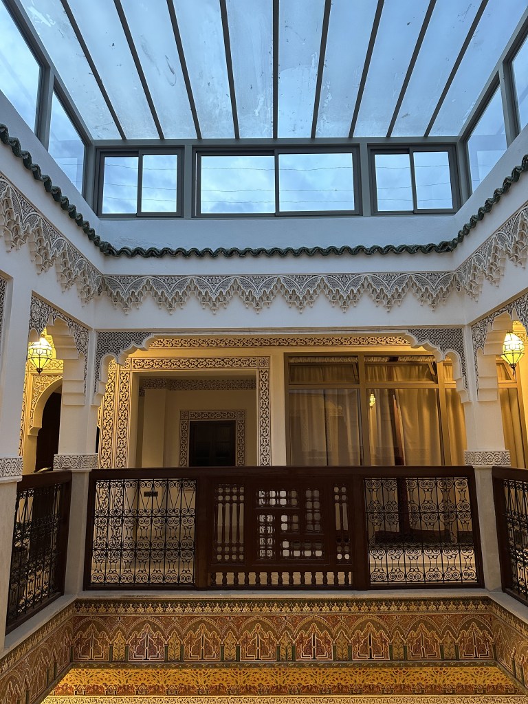Our stay was arranged at a Riad – means, a palace (home of an affluent) turned into a boutique hotel. From the outside, it looks like a very ordinary place- once we get inside, the grandeur unfolds. Huge courtyard that opens to the sky with a see-through retractable roof, magnificently laid tiles on the walls and brightly coloured traditional mosaics on the floor- a master piece of Moroccan tile work, massive chandeliers, very high roofs is a typical Riad. After a simple Italian dinner, we were set to see the stars after a splendid day.